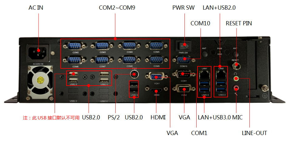 2*USB3.08×USB2.0(其中1USB2.04G復用信號,默認為4G可用,LAN2下方藍色USB接口實際為USB2.0